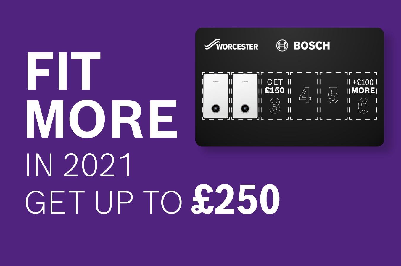 - £250 cashback onto a Worcester Bosch branded Mastercard after purchasing, installing and registering six additional boilers within the promotional window